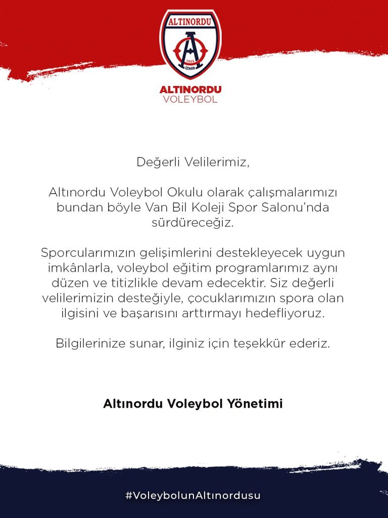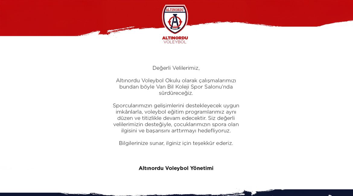 Altınordu Voleybol Okulu olarak çalışmalarımızı bundan böyle Van Bil Koleji Spor Salonu’nda sürdüreceğiz.